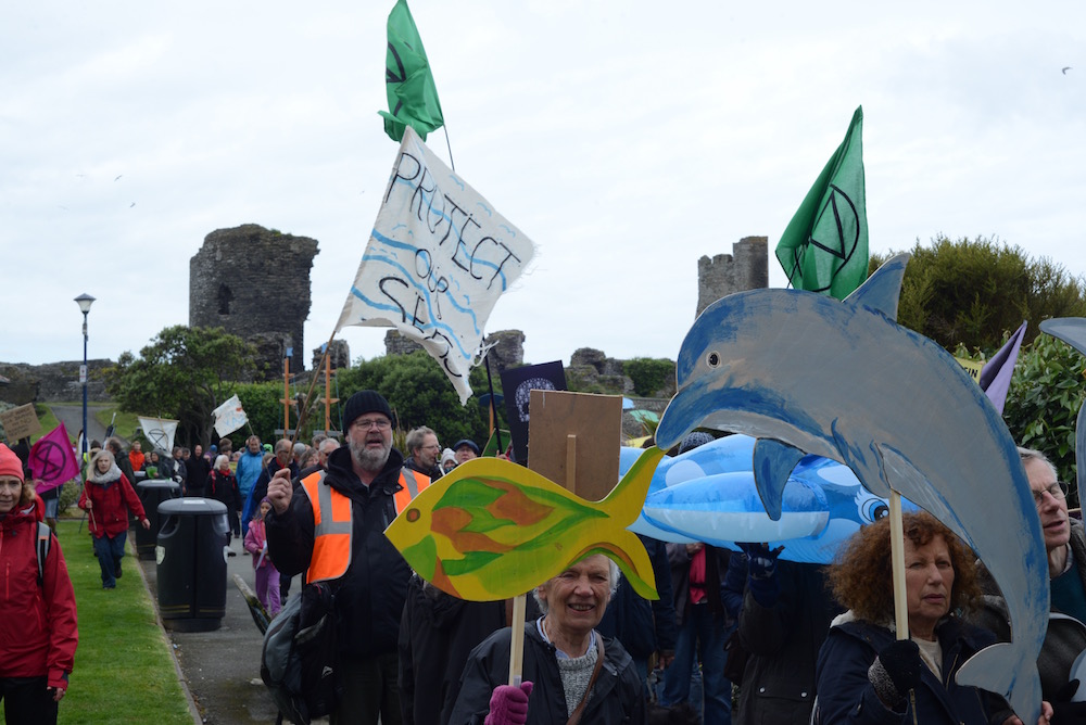 Well the differences for me were many. Travel time for a start. Also weather. While the London and Bristol protests were conducted under a scorching sun, on this particular day it was as if the Irish Sea had decided to register its own issues with the proposed exploration and was letting us know about it with the kind of wind that would be just fine for a brisk day in February and was driving the waves from the high tide onto the beach. And at twelve ten the cavalcade set off, with enough people to fill the promenade from side to side, and made its way along, took a left past the ruins of the town castle, emerged at the top of towns main shopping street. At that point the XR stewards stopped the traffic, and I got to practice my skills at photography while walking down the street backwards (as discussed in my last article). Down the main street and along the road that would lead out of town, and then looping around to end back on the promenade where it started. And there it ended, and the day of activities carried on.