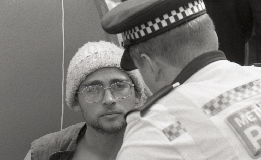 Again, there’s the sense of portraiture rather than news gathering. Without the vibrancy of the signs we start to see the bright April days not in terms of their blue skies but of their harsh shadows, and the faces beneath the placards and regarding me from over their banners are not the faces of partygoers – they’re engaged in the serious business of saving the world.