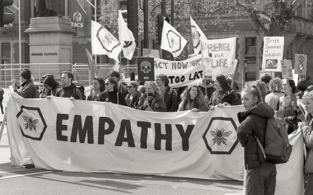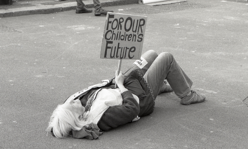 I see the same in more relaxed images taken in other locations – without the colour the eye is drawn to other things. The geometry of people’s stances, the buildings in the background. The message of their banners and placards seems starker to me, more ominous. Perhaps it’s appropriate. For all the festival atmosphere of the Rebellion’s protests, the underlying message is as serious as a heart attack.