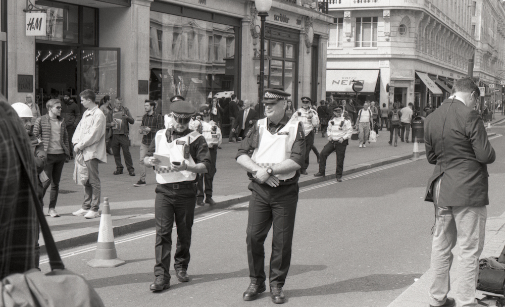 I find it especially in the pictures of the arrest at Oxford Circus. The images seem to me more like portraits than like media images, with the expressions captured in the grain of the film. Without the carnival colours of this seems grimmer, grittier, more businesslike. That’s a large part of why I’ve returned to film – for a street photographer urban grit is very much a stock in trade. With the arrest images, there’s a story to be read in people’s expressions and body language.