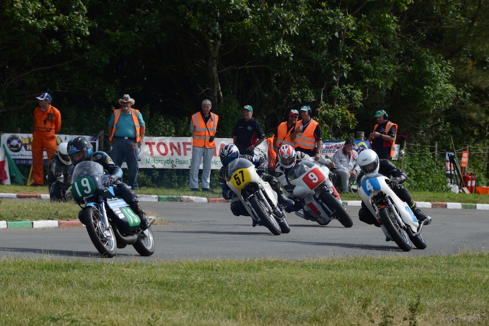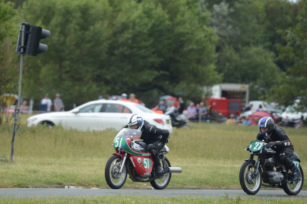 Heading back to trackside I found a clear spot (spectators were thinning out a little as the afternoon progressed) and settled in to make race shots. We were also treated to two “Parade’s Of Racing Exotica” featuring 28 bikes from 1934 to 2000, all outfitted with race pedigrees and names like “BSA Rob North Rocket 3” and “Maxton Yamaha” which while they didn’t mean a whole lot to me, suggested tales of race specials and podium finishes many years earlier.