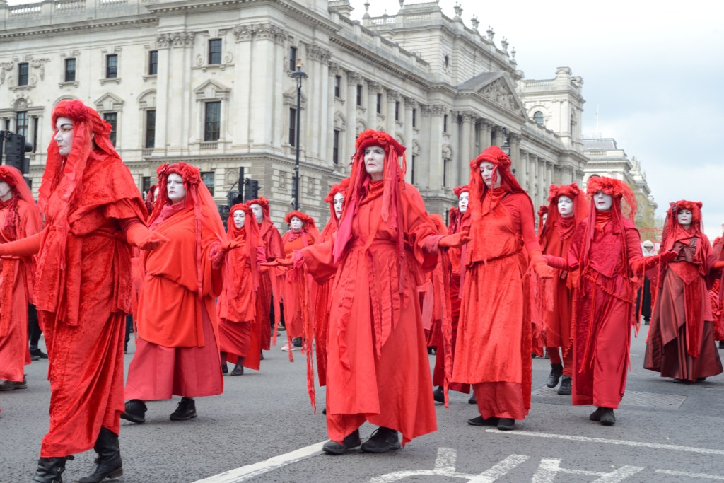 I forget how many of these figures in red I’ve seen over the four years that I’ve followed these protests, but it’s more than a few, in many places and in all weathers, and still it’s a sight worth seeing. A mass of crimson draped figures, movements synchronised, slow and deliberate move as a body along the road. And following them – well following them we have the group who I’d be following for the next hour or so.