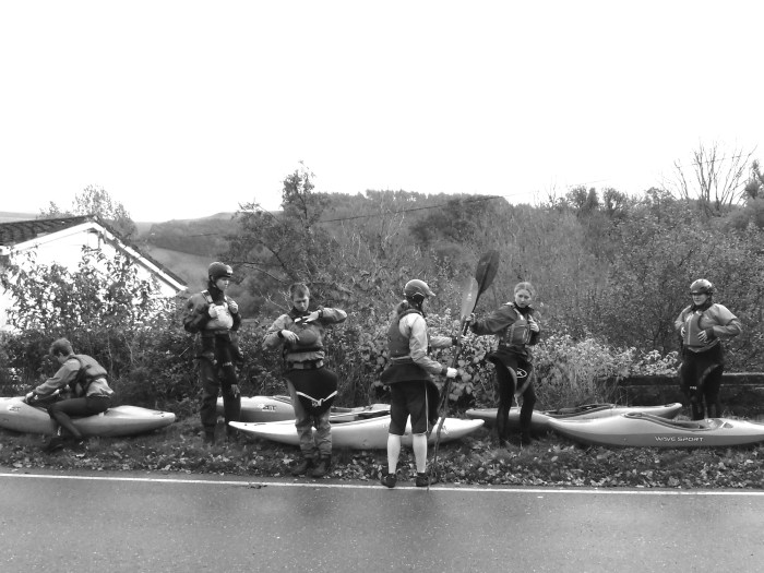 All together, we drift down. The river’s full after the recent rains, tall grass and vegetation show partially submerged where they’ve been submerged. Every tree hangs its branches low across the flow which insists on dragging me through each spray of twigs – lean forward and headbutt your way through. Follow the line of plastic helmets above plastic craft against the dark background of riverside forestry. Go west old man. Watch out for the shallows.